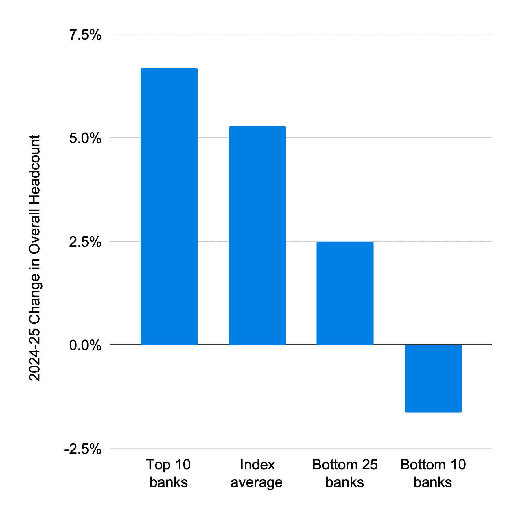 Of the 50 banks ranked in the Evident AI Index, the top 10 have grown their headcount 25% more than the average firm since last year.
