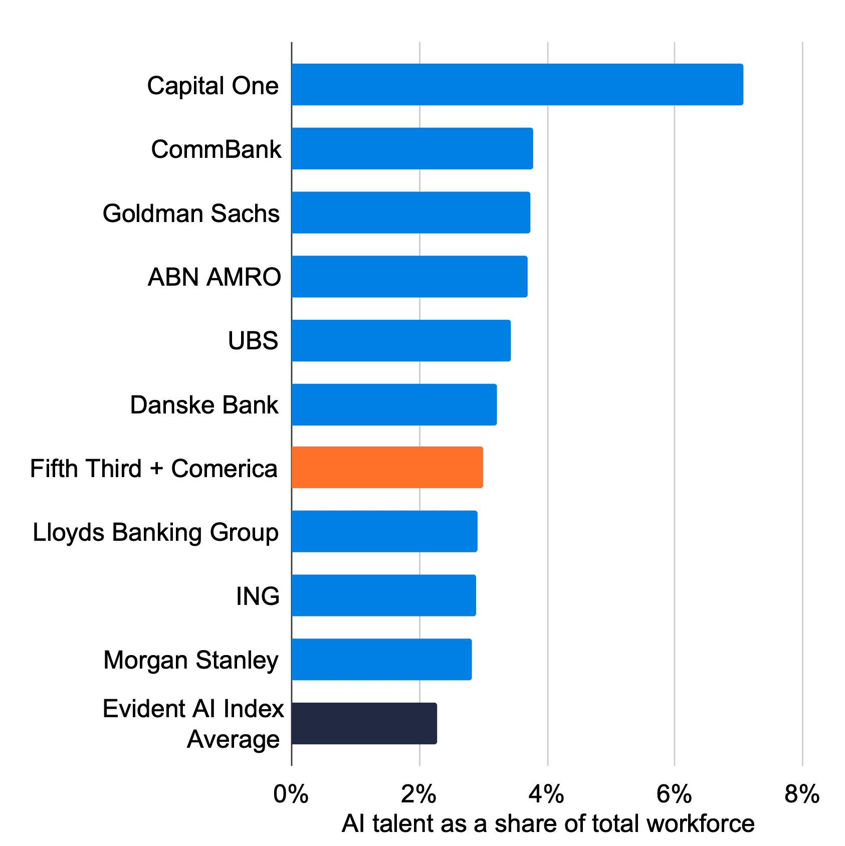 Fifth Third and Comerica would have one of the highest talent densities – a measure of the share of the bank working on AI – of any bank in the Evident AI Index