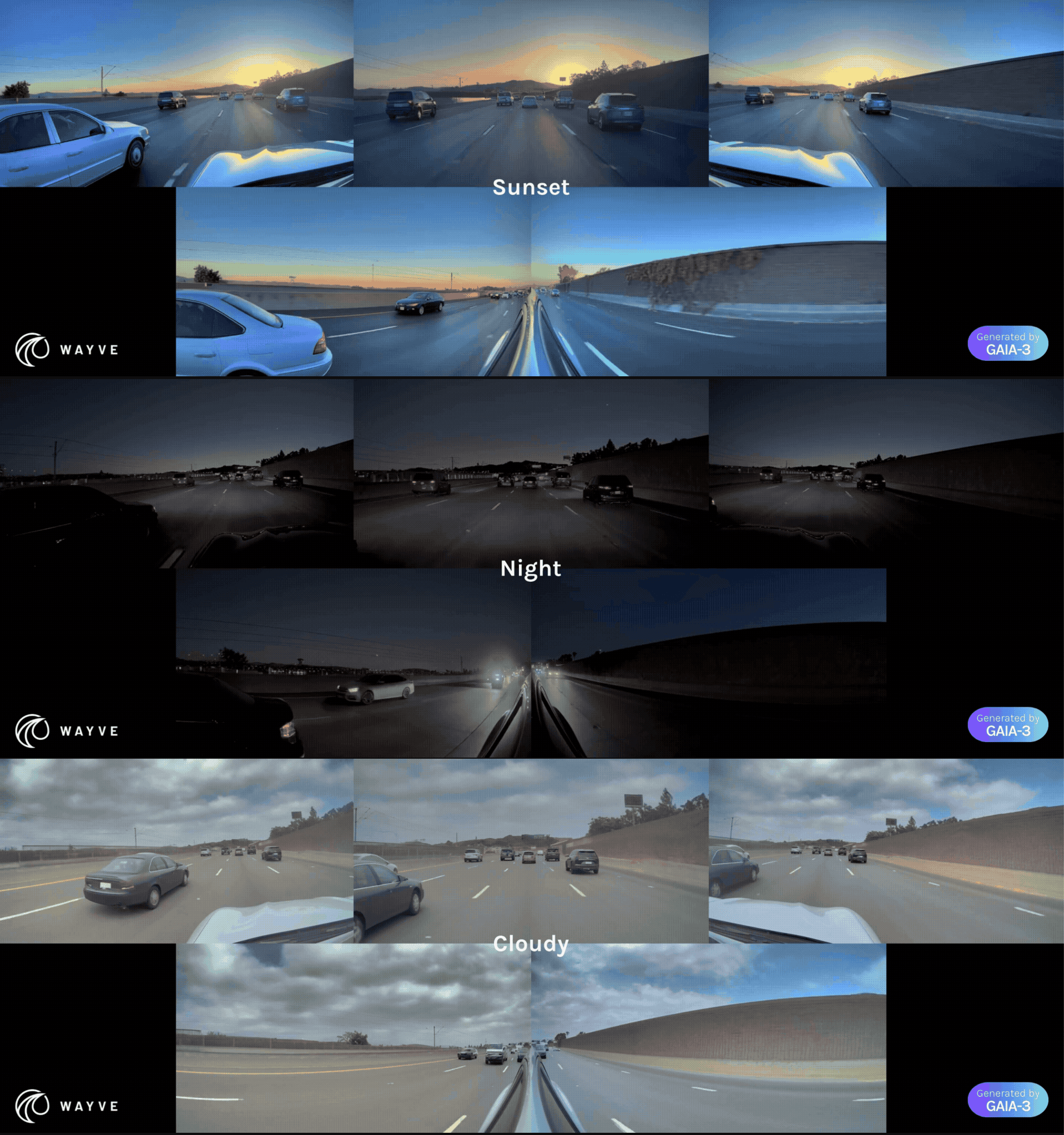 Wayve’s GAIA-3 world model can simulate the same scenario in different lighting conditions to test the response of their self-driving car.