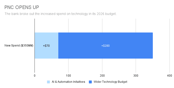 In his earnings call this week, CEO Bill Demchak joined the few banks that have put concrete numbers on how much they plan to spend on AI in 2026. PNC’s current technology budget is roughly $3.5 billion and is expected to grow by about 10% this year, he said. “And inside that, you know AI is 20% of that increase, beyond what we spend already,” Demchak added. Across the sector, as we wrote last week, AI spending isn’t only going up but going up significantly as a share of the tech spend. (see “What Goes Up”, The Banking Brief, January 15)