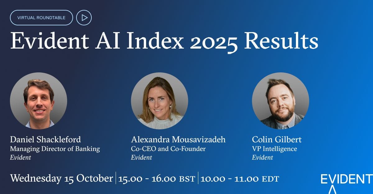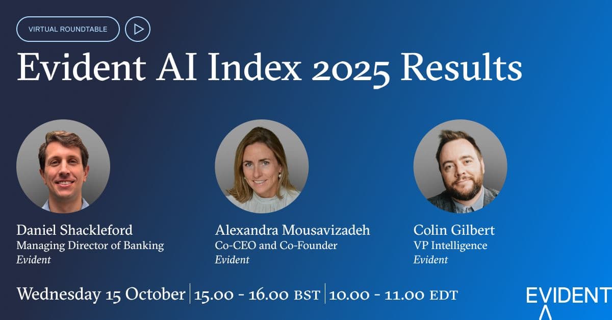 Join Evident’s Alexandra Mousavizadeh, Daniel Shackleford and Colin Gilbert virtually at our upcoming Evident AI Index Roundtable on Wednesday, Oct. 15 at 15:00 BST (10:00 EDT).