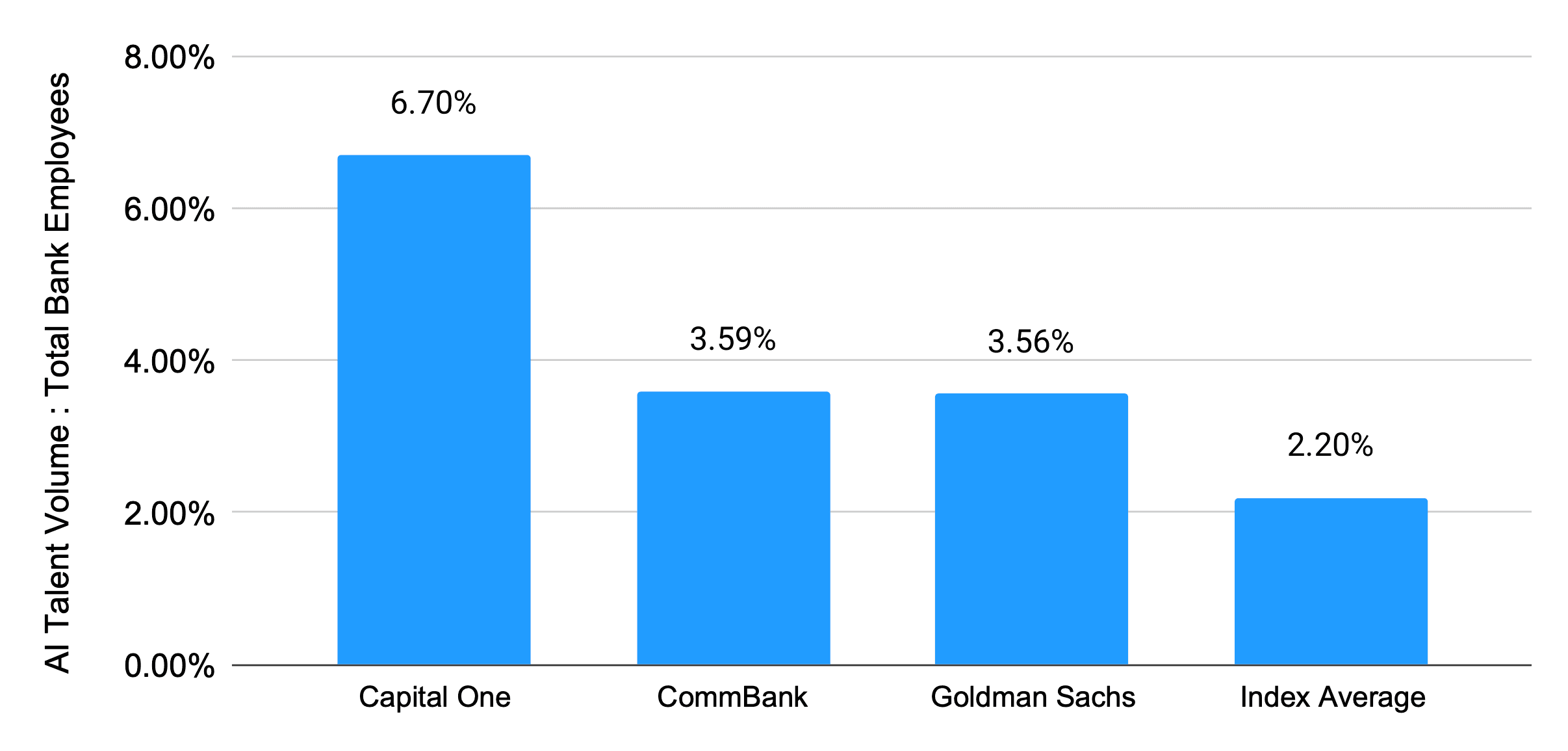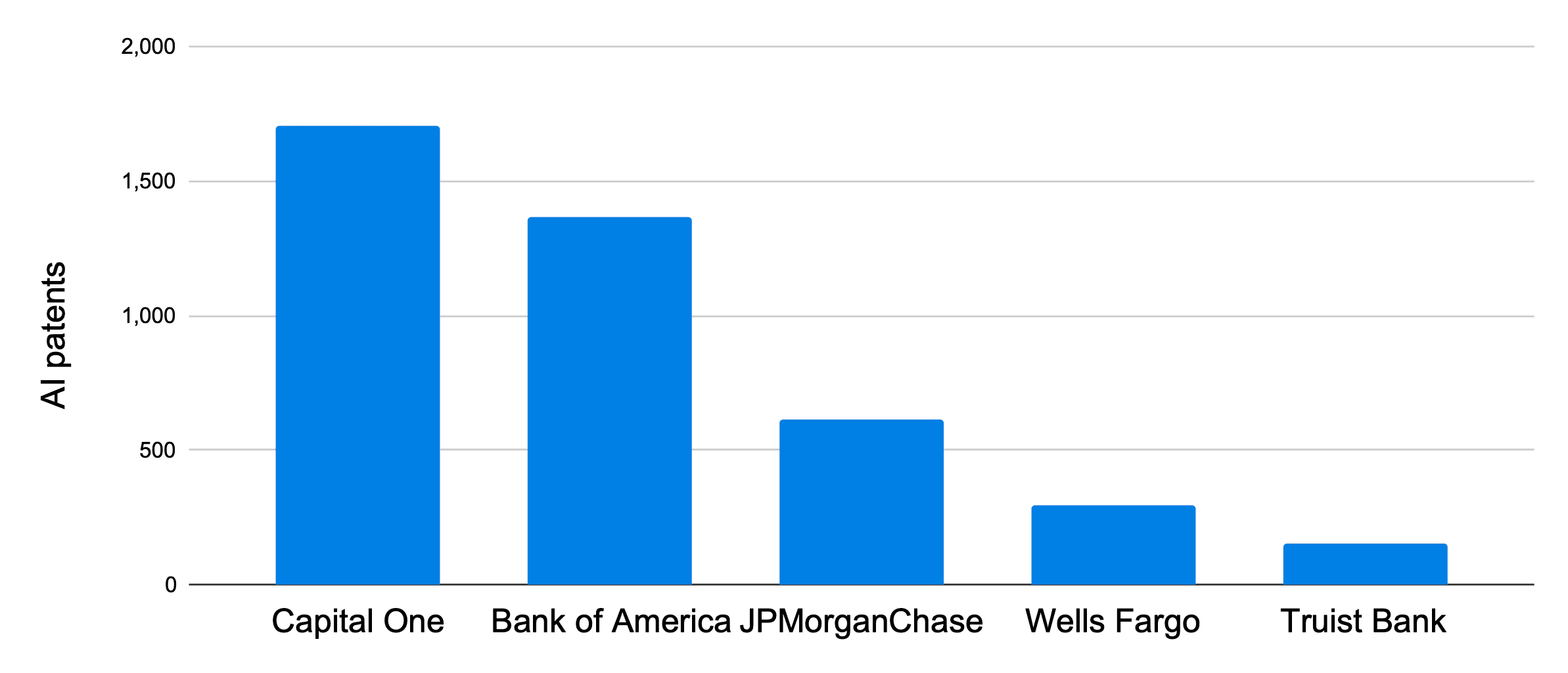Quick stats: Capital One has filed more than 1,700 AI patents, the most of the 50 banks we track. The bank grew its AI team by 73% in the last year and doubled its AI research headcount – in no small part due to its big acquisition.