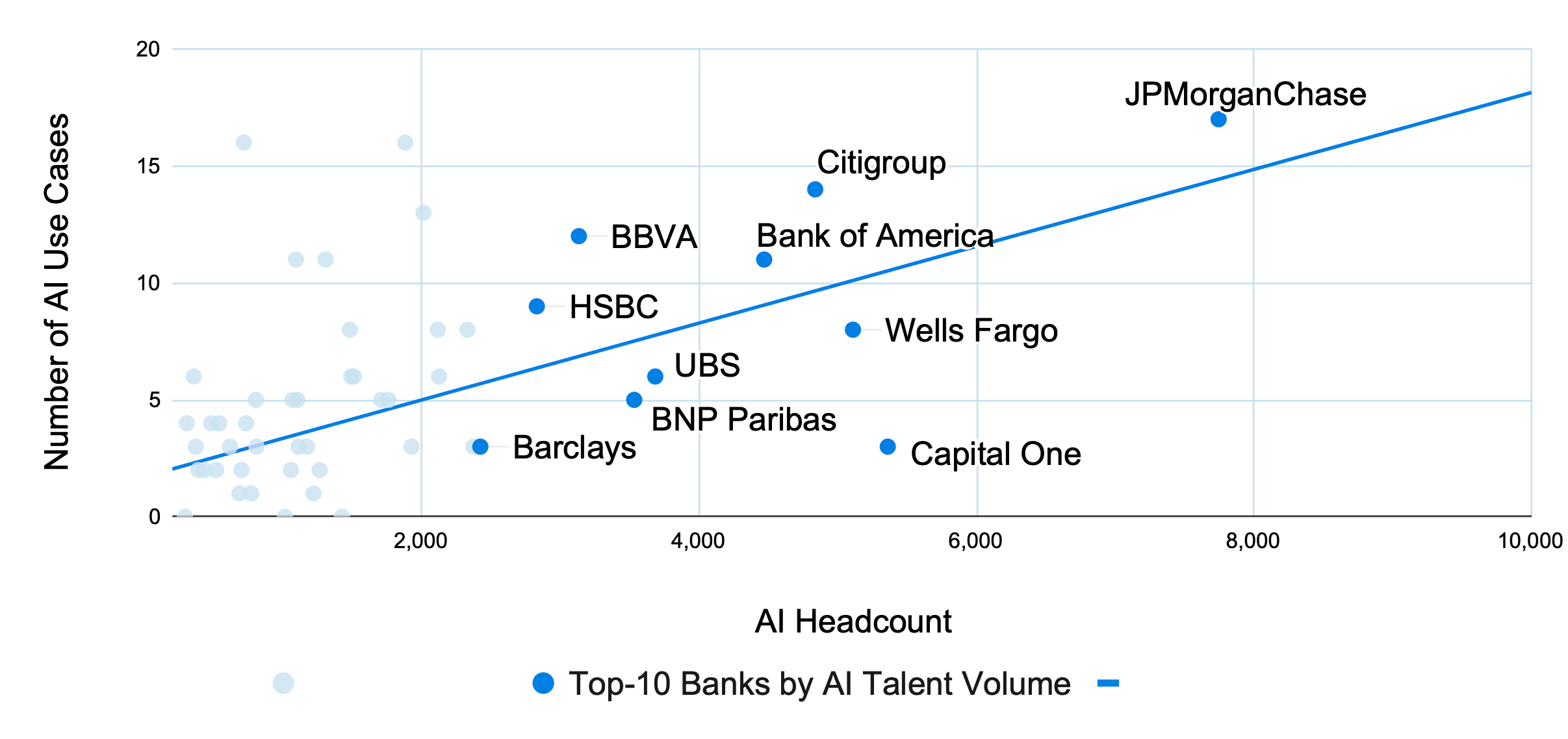The Australian bank jumped up three spots in the Talent pillar and is growing its AI talent at twice the rate of the overall Index – faster than any bank other than Capital One. The 50 banks we track now employ more than 90,000 employees on AI, up from 70,000 a year ago. The talent arms race isn’t just a measure of a bank’s draw for technical talent; the eggheads are helping banks roll out more AI tools – and one day 🤞 reap widespread benefits. On average, the 10 banks with the highest AI headcount rolled out nearly double the use cases than the rest of the banks we track (See item above).