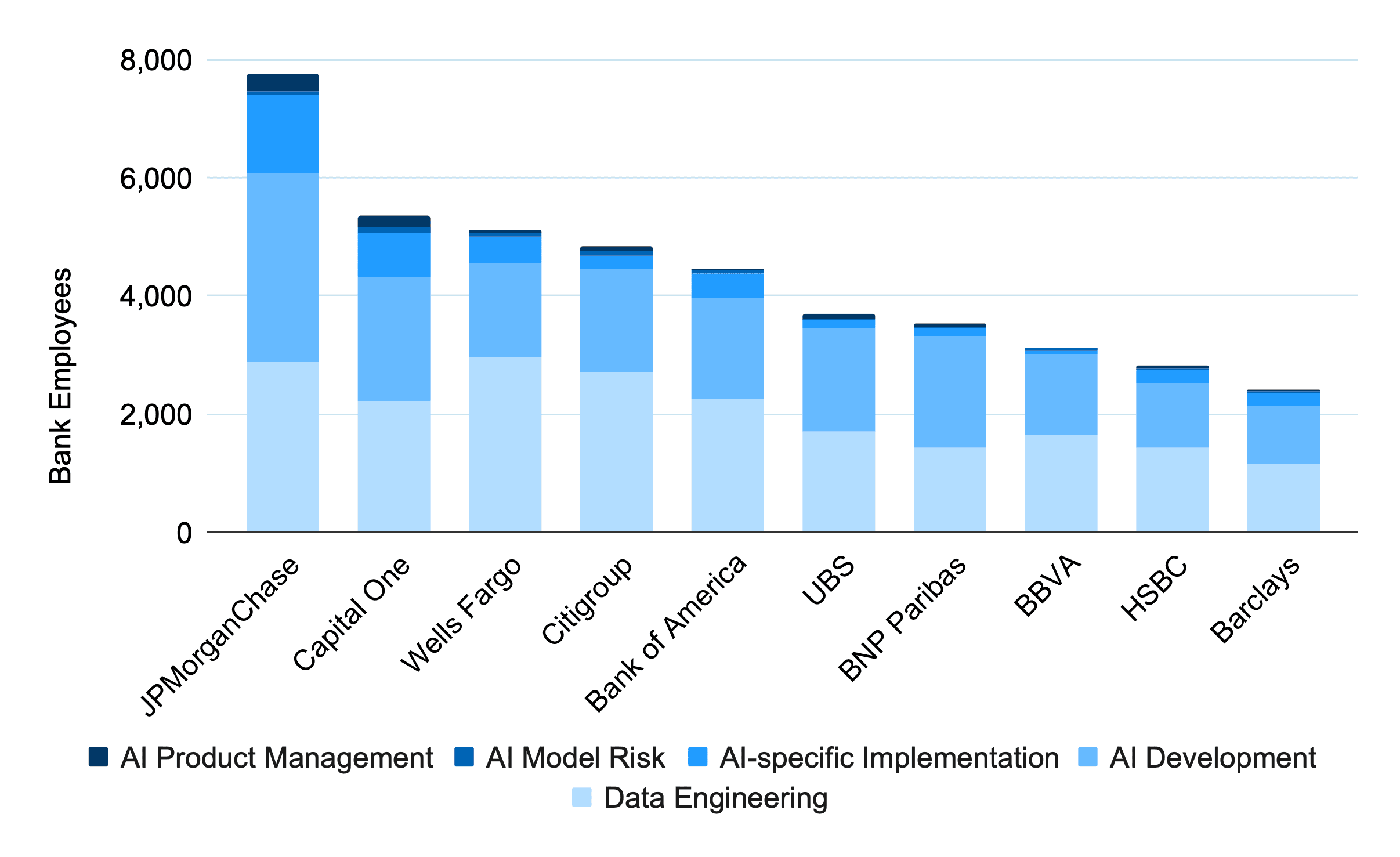 Quick Stats: Of the 50 banks we track, JPMC employs the most AI talent, publishes the most research papers, devotes the most resources to responsible AI and has one of the deepest benches of executives talking about AI to investors.