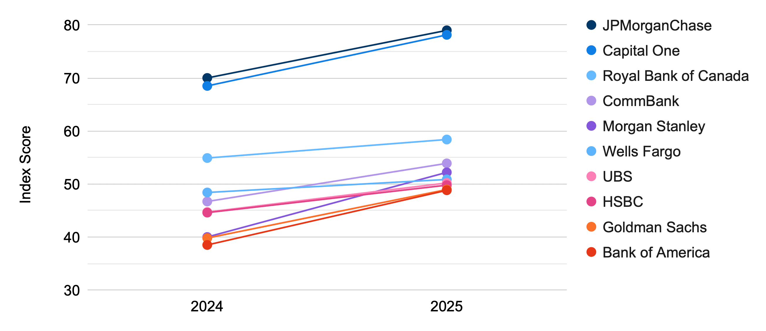 The first bank to score perfect marks in the Leadership category, the Index’s top bank continued providing updates on the financial benefits of ROI in 2025. JPMC rose above a crowded field: 48 of the 50 banks put out press releases about AI, up from 43 last year. Thirty-six CEOs did an AI-focused interview, up from 31 a year ago.