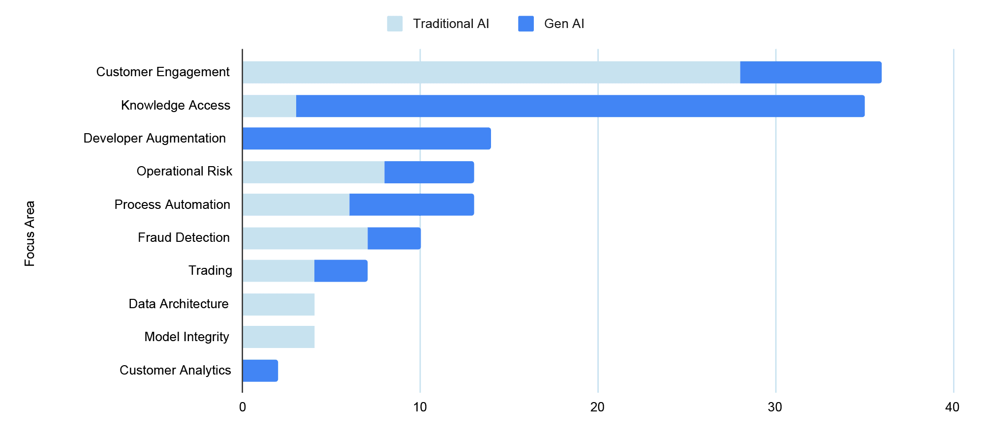 - Within knowledge access (think: rapid discovery and document summarization tools for financial analysts) there’s a similar concentration, but the vast majority of those use cases (91%) rely heavily on Gen AI to unlock productivity gains.