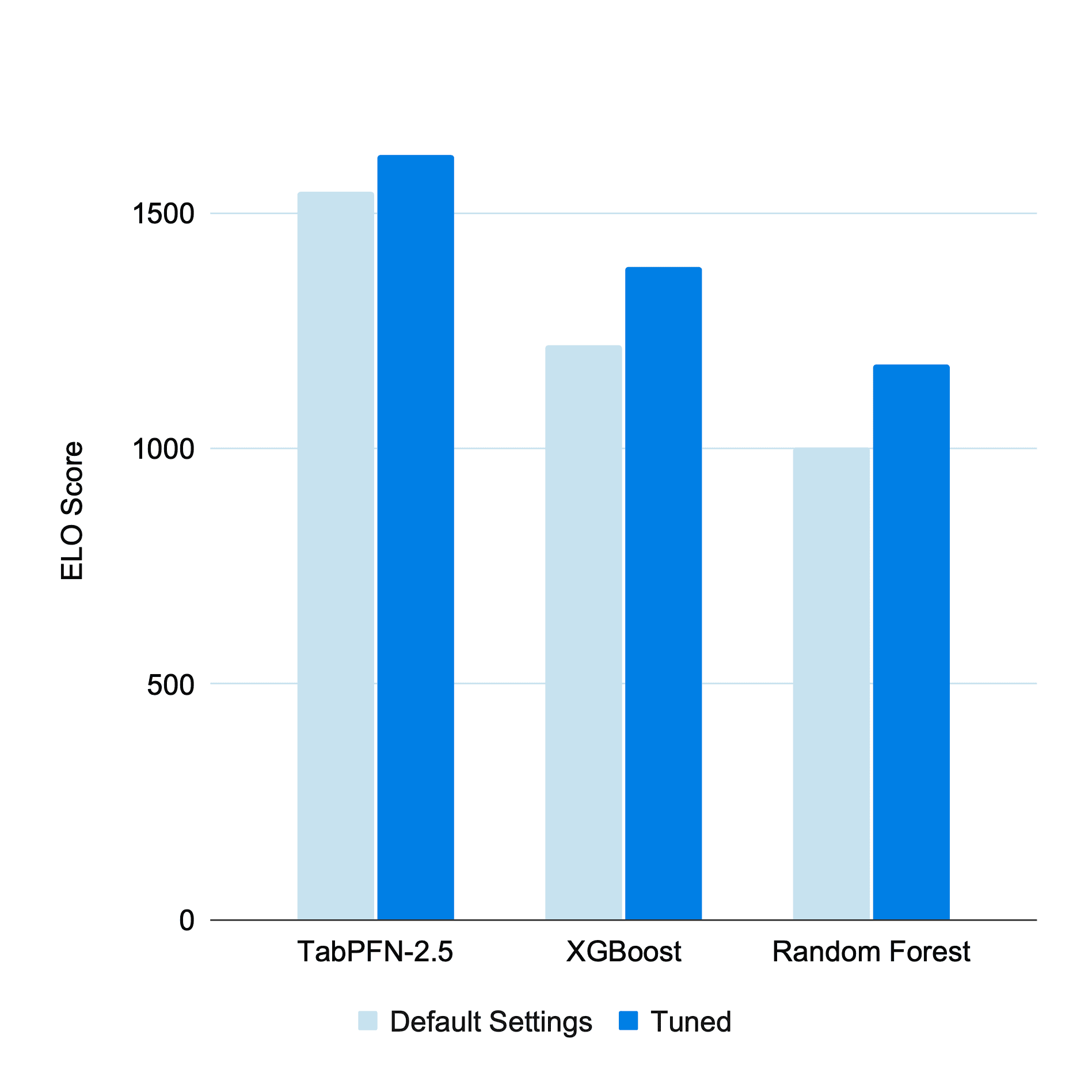 Prior Labs’ tabular foundation model, TabPFN, consistently makes more accurate predictions based on smaller datasets than industry-standard ML models like XGBoost and Random Forest, both out of the box (default settings) and after some some adjustments to make it fit the data better (tuned).