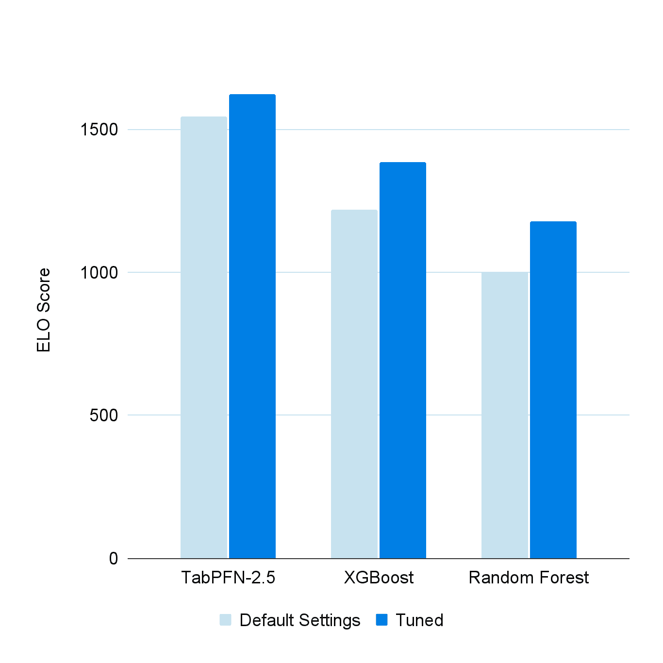 Prior Labs’ tabular foundation model, TabPFN, consistently makes more accurate predictions based on smaller datasets than industry-standard ML models like XGBoost and Random Forest, both out of the box (default settings) and after some some adjustments to make it fit the data better (tuned).