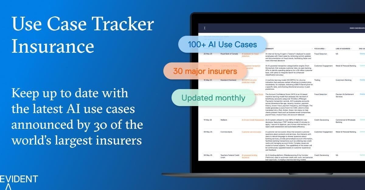 Evident is the intelligence platform for AI adoption in financial services. We help leaders stay ahead of change with trusted insights, benchmarking, and real-time data through our flagship Banking Index, our new Insurance Index, Insights across Talent, Innovation, Leadership, Transparency and Responsible AI pillars, a real-time Use Case Tracker, community and events. Watch our latest roundtable exploring the insights from our new Insurance Index, and get in touch to hear more about how Evident can help your business adopt AI faster.