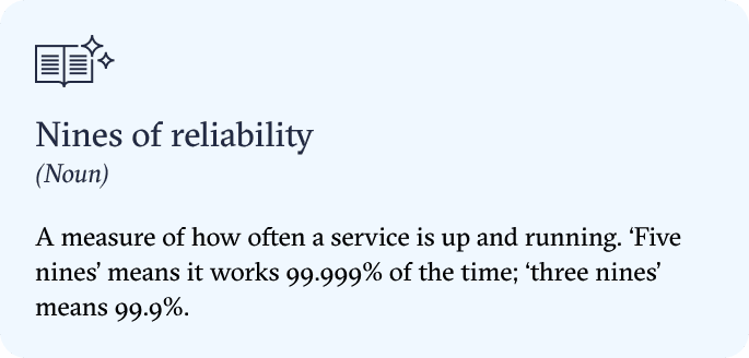 Some tech services like cloud providers AWS, Azure and Google Cloud have plenty of nines – five to be exact in the past quarter. In other words, if you’re running stuff on them, they’d be down just 0.01% of the time, equal to five minutes a year.